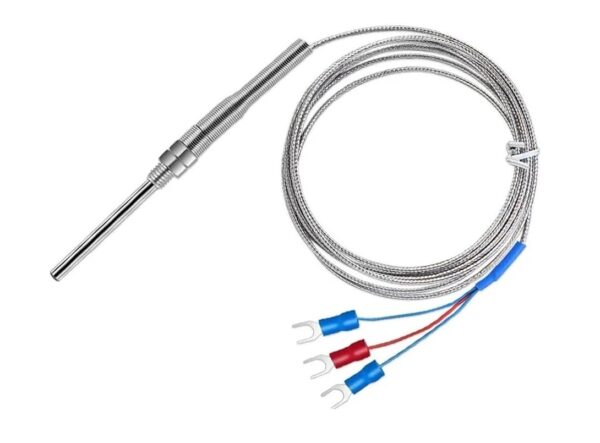 Senzor teploty PT100 5 metrov 0-400°C v kovovom kábli. Senzor je ukončený skurtkou M8 a čidlom dlhým 5 cm. Skladom máme podobný senzor s dĺžkou kábla 1 meter.